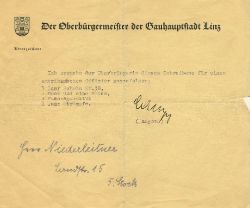 Eine der letzten von NS-Oberbürgermeister Langoth unterschriebenen Anweisungen, in der die Ausfolgung von Gewand an einen amerikanischen Offizier veranlasst wurde. Ausgestellt zwischen dem 5. und 7. Mai.