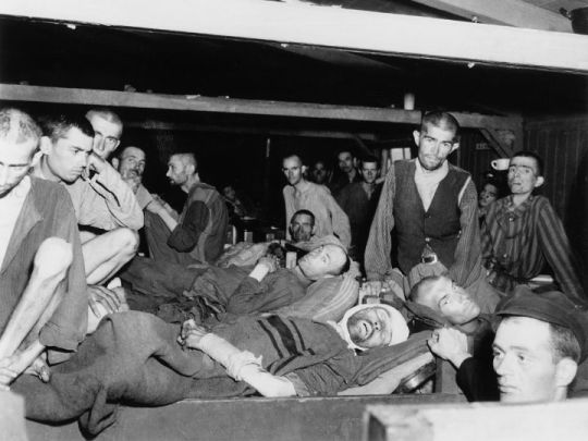Überlebende KZ-Häftlinge im Evakuierungslazarett der US Armee.