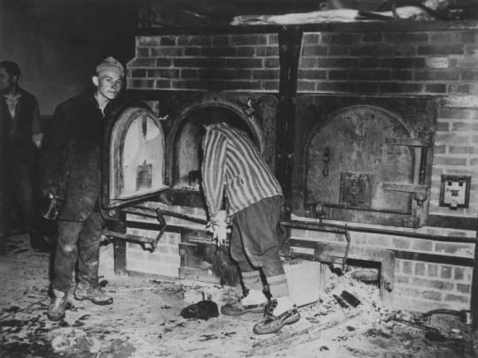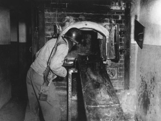 Ein US-Soldat inspiziert den Ofen des Krematoriums im KZ Mauthausen.