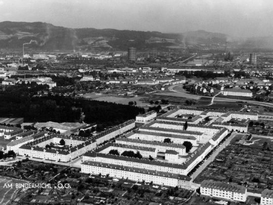 Luftaufnahme der Wohnanlagen am Bindermichl, wo das "Camp Bindermichl" für jüdische DPs untergebracht war.