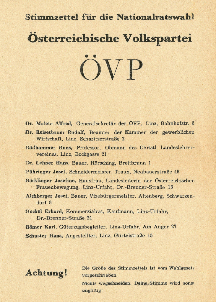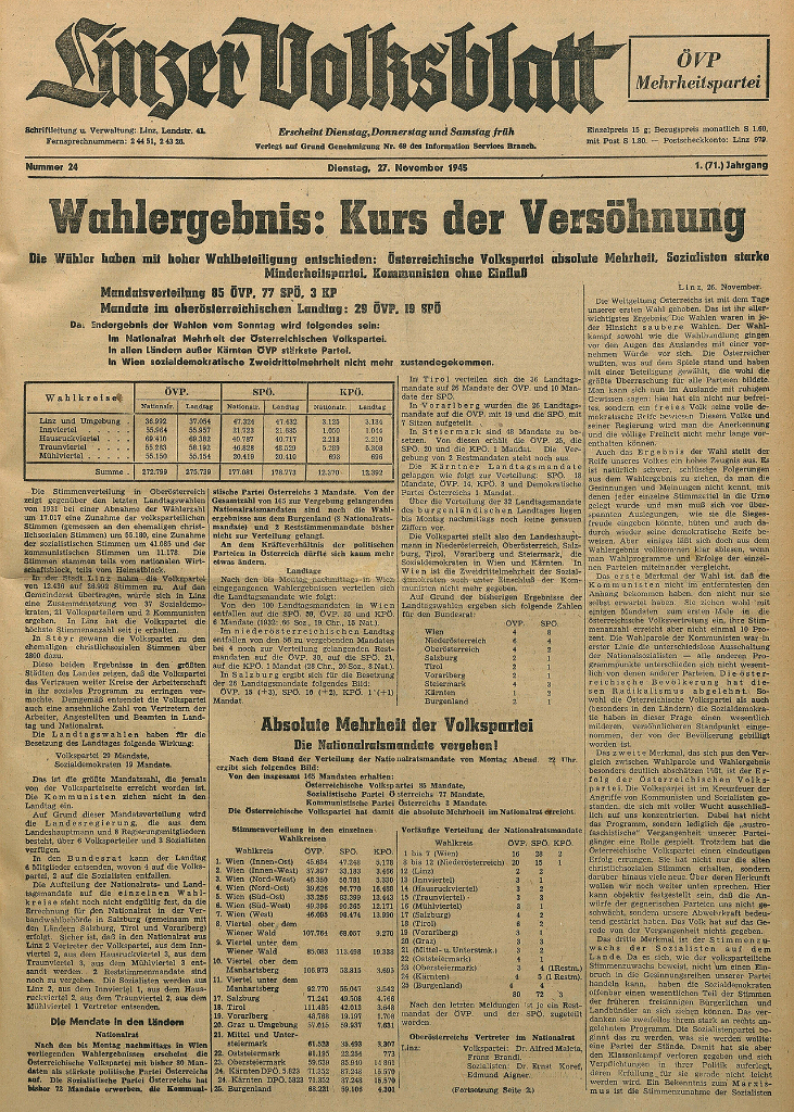 Erstmals seit 15 Jahren konnten am „Kathreintag“, dem 25. November 1945, wieder demokratische Wahlen in der Republik Österreich stattfinden. Gewählt wurden die Abgeordneten zum Nationalrat ebenso wie die Mitglieder des oberösterreichischen Landtags. Die Ergebnisse der Nationalrats- und Landtagswahl zog die Bezirkswahlbehörde auch für die Verteilung der Mandate im Linzer Gemeinderat heran.